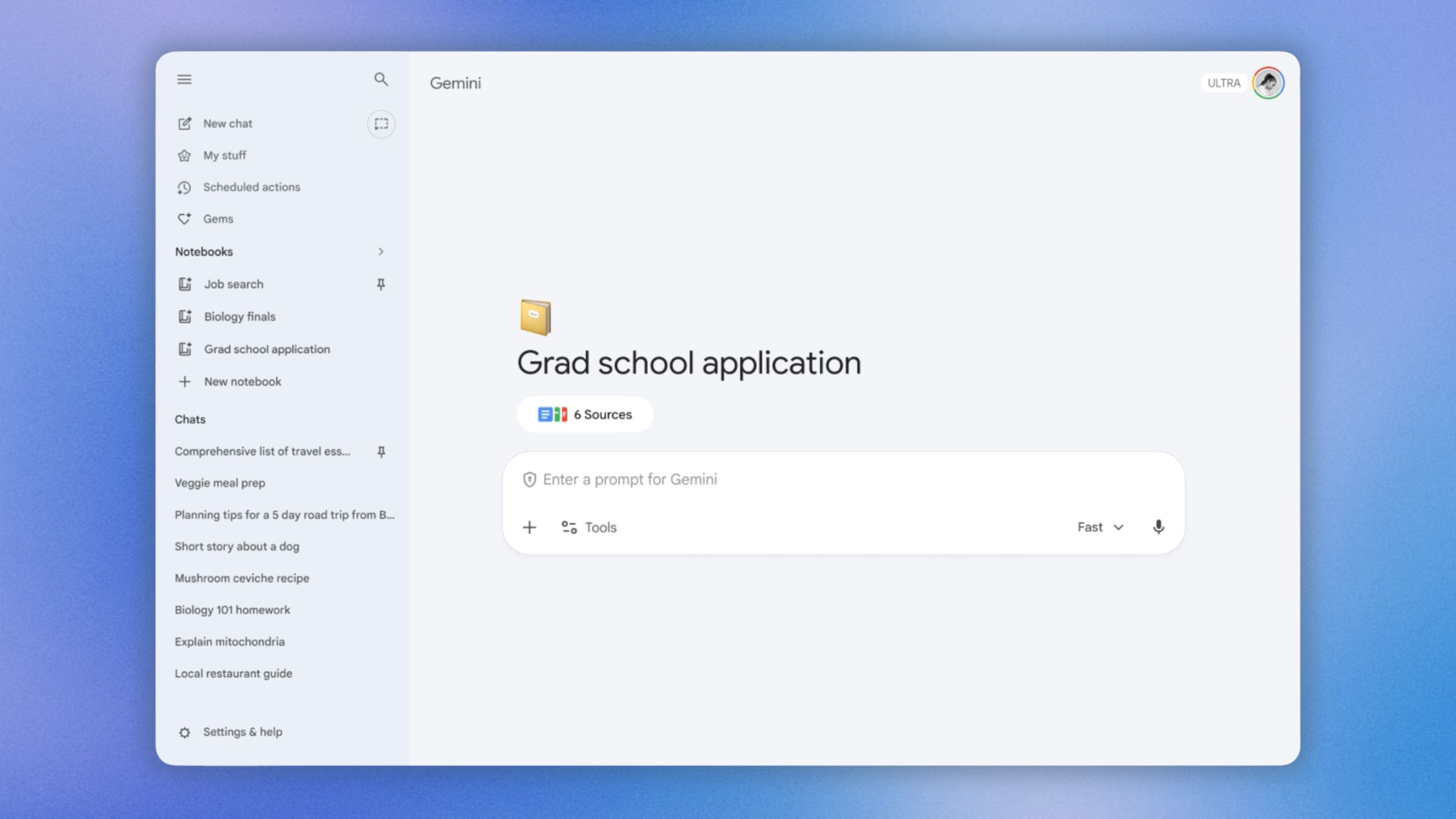 Step 4: Chat Within Your Notebook Start asking questions and Gemini will use your uploaded sources alongside its own knowledge and web search to provide grounded answers. You can also move past Gemini chats into this notebook to keep everything organized.